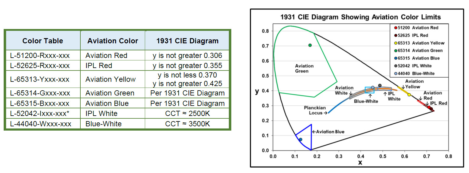 Complimentary to chromaticity coordinates called out in SAE-AS25050 and other aerospace lighting standards used in integrally illuminated aircraft instruments and panels.